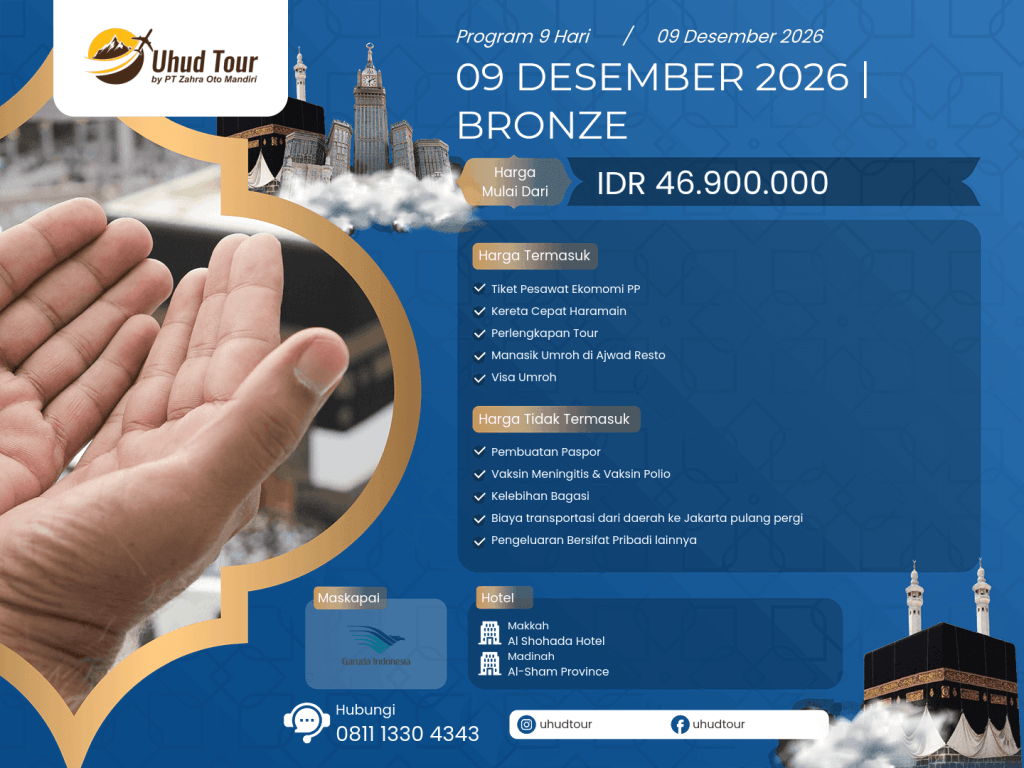 - Pihak Uhud Tour tidak dapat melakukan penukaran terhadap Perlengkapan Perjalanan yang mengalami kerusakan pada saat perjalanan telah dimulai, olehkarenanya hal tersebut menjadi tanggung jawab Calon Jemaah.